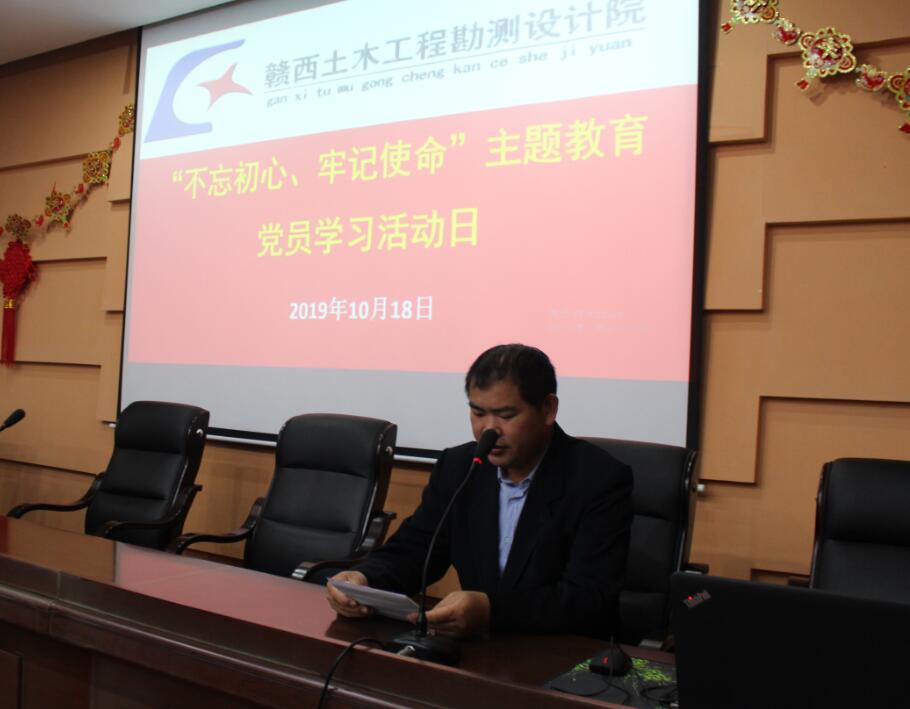 10月18日上午,院在职党员支部组织开展“不忘初心、牢记使命”主题教育党员学习活动日。会议由在职党员支部书记、副院长胡志坚主持,支部在家党员参加学习讨论,院党总支书记、院长何军同志以普通党员身份到会参与。